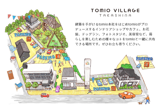 建築を手がけるtomio本社をはじめtomioがプロデュースするインテリアショップやカフェ、お花屋、ドッグラン、フォトスタジオ、美容室など、暮らしを楽しむための様々なコトをtomioと一緒に共有できる場所です。ぜひお立ち寄りください。